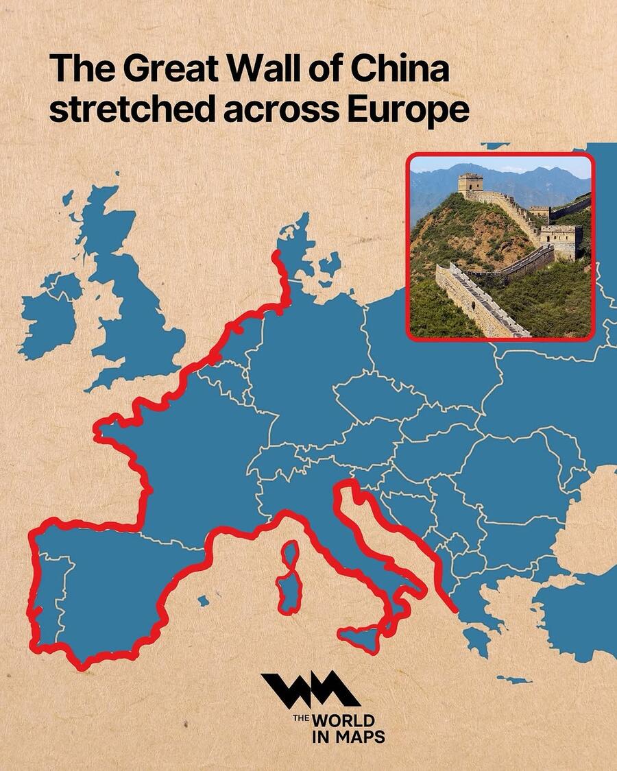 The map above shows how long the Great Wall of China is compared to Europe's coastline. >>>