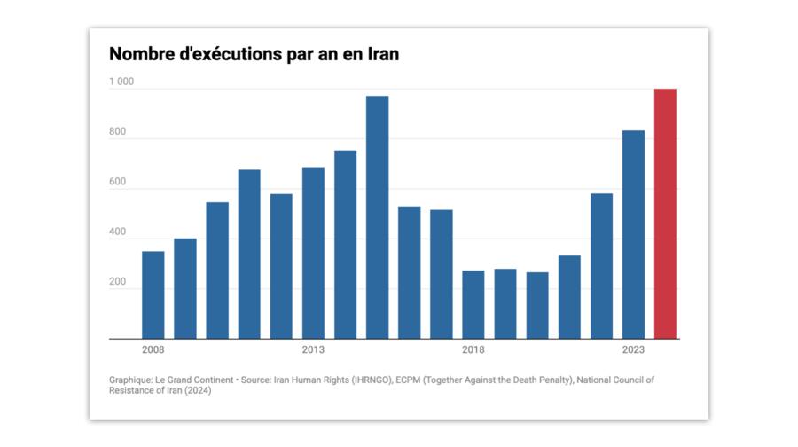 Selon un rapport du Conseil national de la rsistance iranienne, au moins 1 000 prisonniers auraient t excuts dans les prisons iraniennes lan dernier soit le chiffre le plus lev depuis au moins 30 ans. Derrire laugmentation du nombre de mises