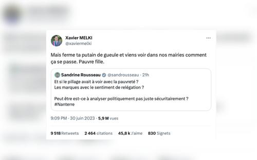 Le maire divers droite de Franconville (Val-d'Oise), Xavier Melki, s'en est violemment pris à Sandrine Rousseau sur Twitter vendredi, après ses propos concernant les récents pillages en France. «Mais