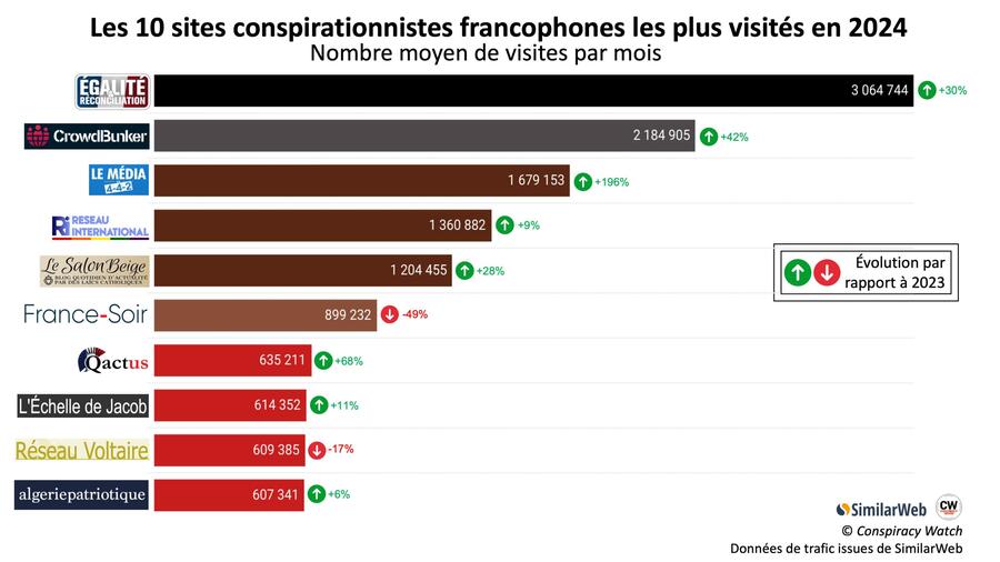 Avec prs de 13 millions de visiteurs mensuels cumuls, les dix principaux sites conspirationnistes francophones ont connu en 2024 une progression notable de leur audience. Une croissance qui confirme le regain dinfluence de la complosphre, porte
