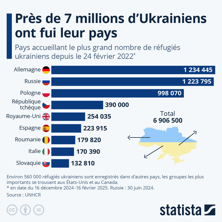 Cette infographie dtaille le nombre de rfugis Ukrainiens accueillis par les pays en ayant reu le plus depuis le dbut de l'invasion de l'Ukraine par la Russie.