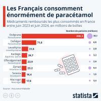 Cette infographie dtaille les mdicaments rembourss les plus consomms en France entre juin 2023 et juin 2024, en millions de botes.